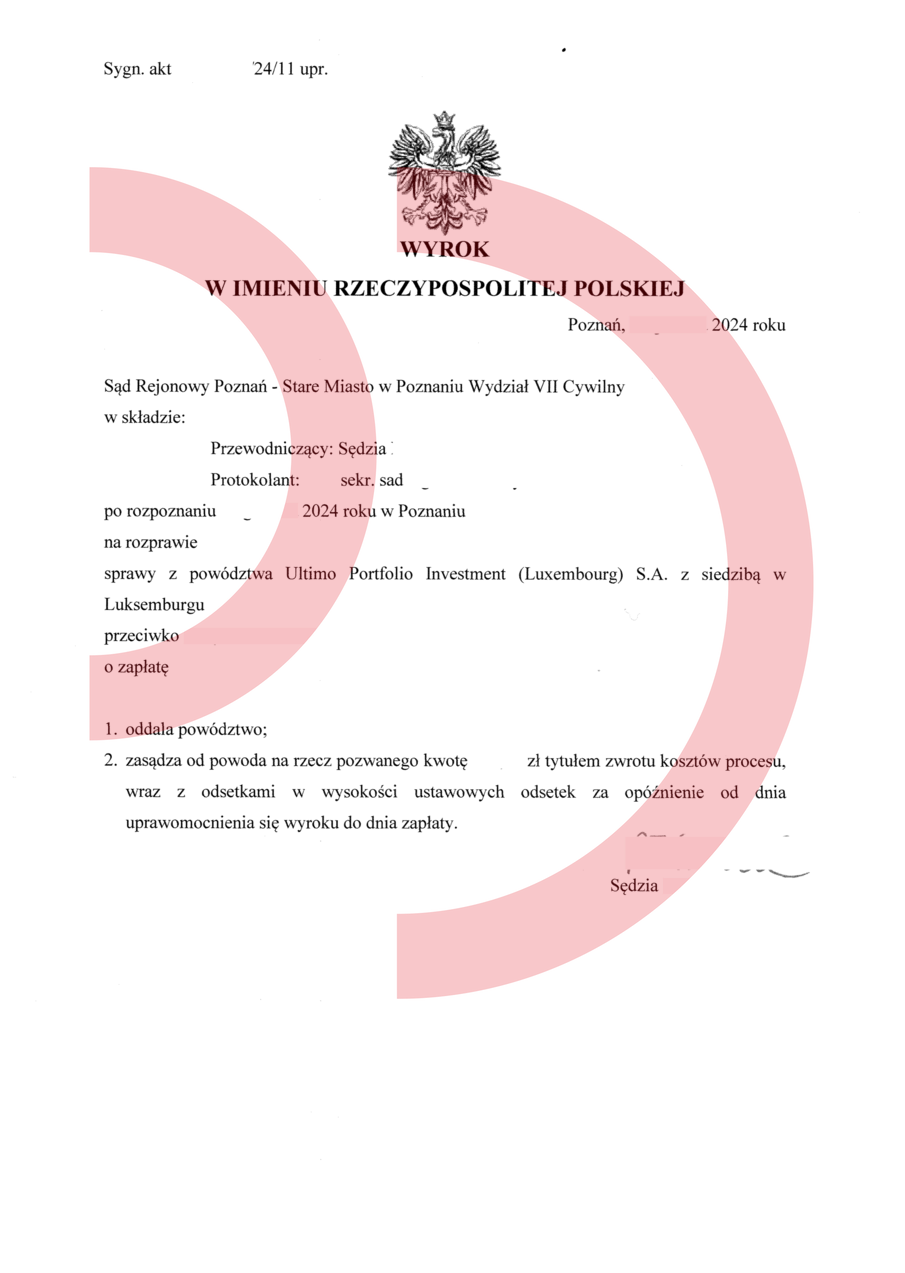 Uzyskany efekt: Powództwo oddalone w całości, brak odsetek, brak kosztów procesu.