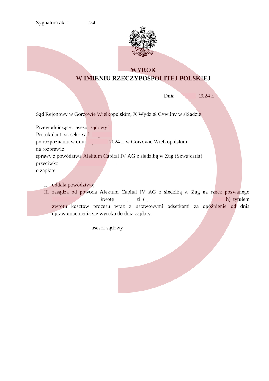 Uzyskany efekt: Powództwo oddalone w całości, brak odsetek, brak kosztów procesu.