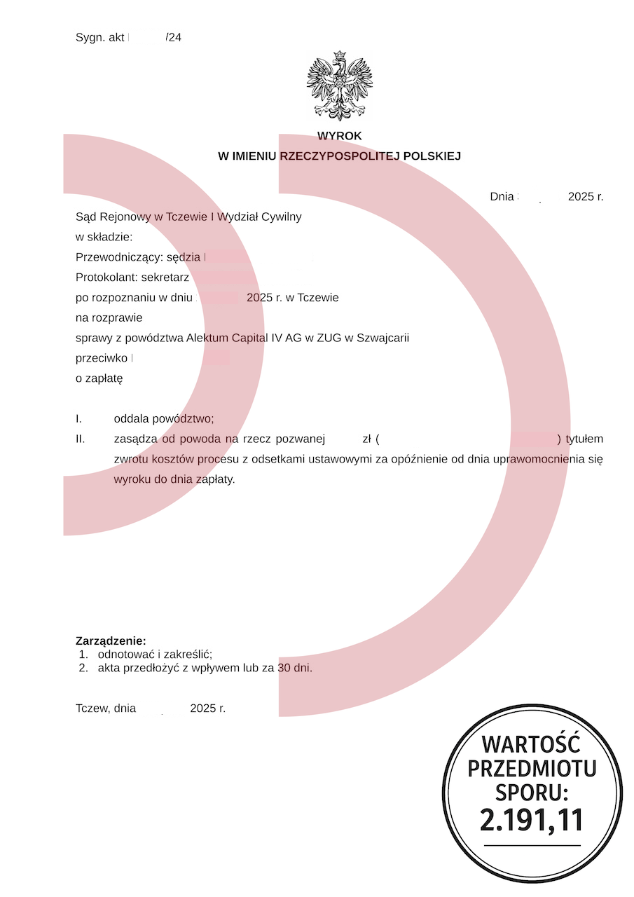 Uzyskany efekt: Powództwo oddalone w całości, brak odsetek, brak kosztów procesu