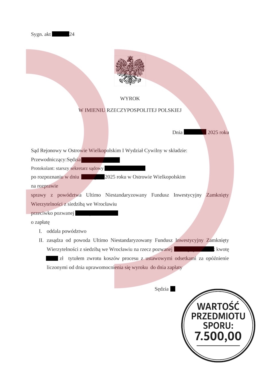 Uzyskany efekt: Powództwo oddalone w całości, brak odsetek, brak kosztów procesu