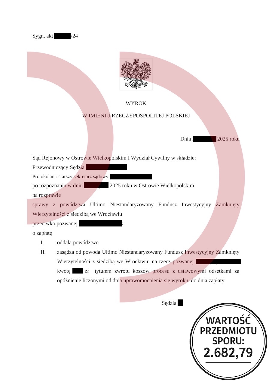 Uzyskany efekt: Powództwo oddalone w całości, brak odsetek, brak kosztów procesu