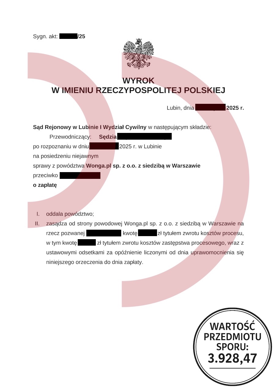Uzyskany efekt: Powództwo oddalone w całości, brak odsetek, brak kosztów procesu