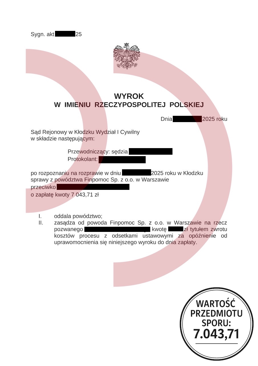 Uzyskany efekt: Powództwo oddalone w całości, brak odsetek, brak kosztów procesu