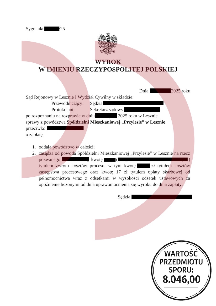 Uzyskany efekt: Powództwo oddalone w całości, brak odsetek, brak kosztów procesu