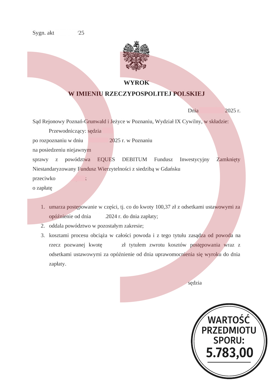 Uzyskany efekt: Powództwo oddalone w całości, brak odsetek, brak kosztów procesu