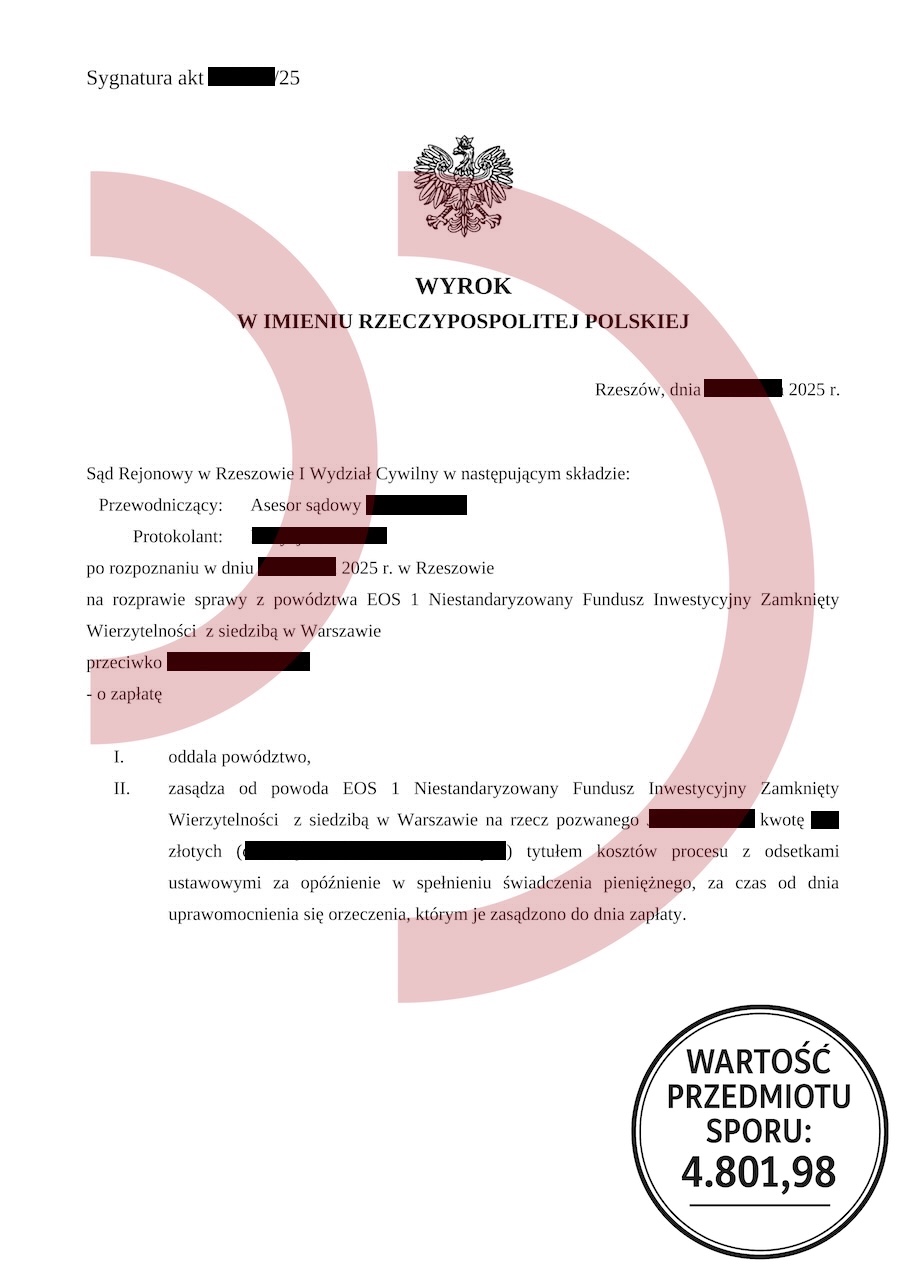 Uzyskany efekt: Powództwo oddalone w całości, brak odsetek, brak kosztów procesu