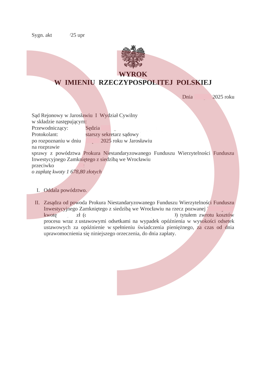 Uzyskany efekt: Powództwo oddalone w całości, brak odsetek, brak kosztów procesu