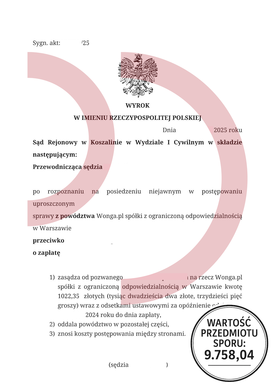 Uzyskany efekt: Powództwo oddalone w całości, brak odsetek, brak kosztów procesu