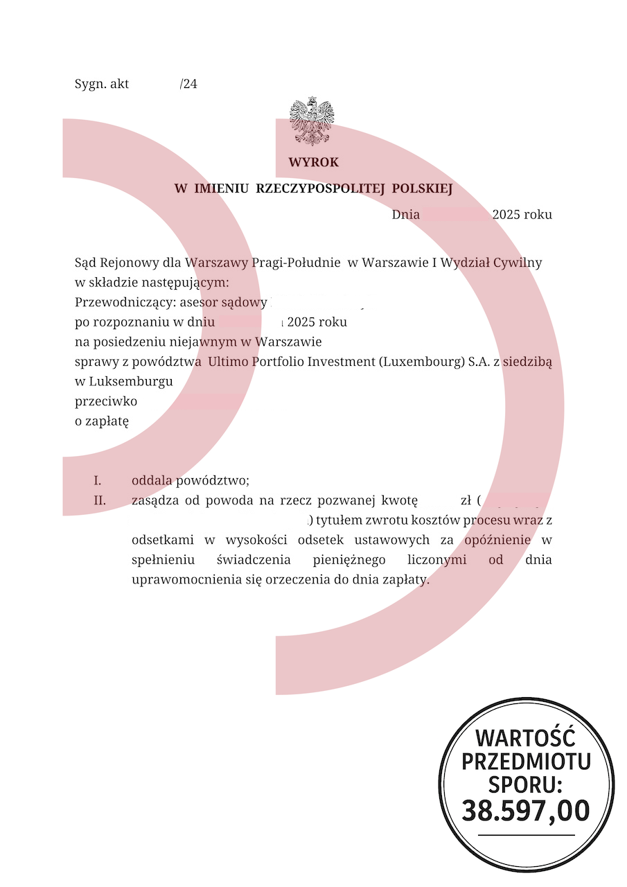 Uzyskany efekt: Powództwo oddalone w całości, brak odsetek, brak kosztów procesu