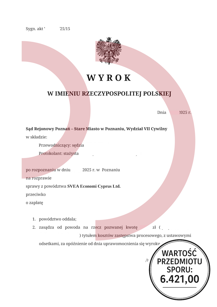 Uzyskany efekt: Powództwo oddalone w całości, brak odsetek, brak kosztów procesu