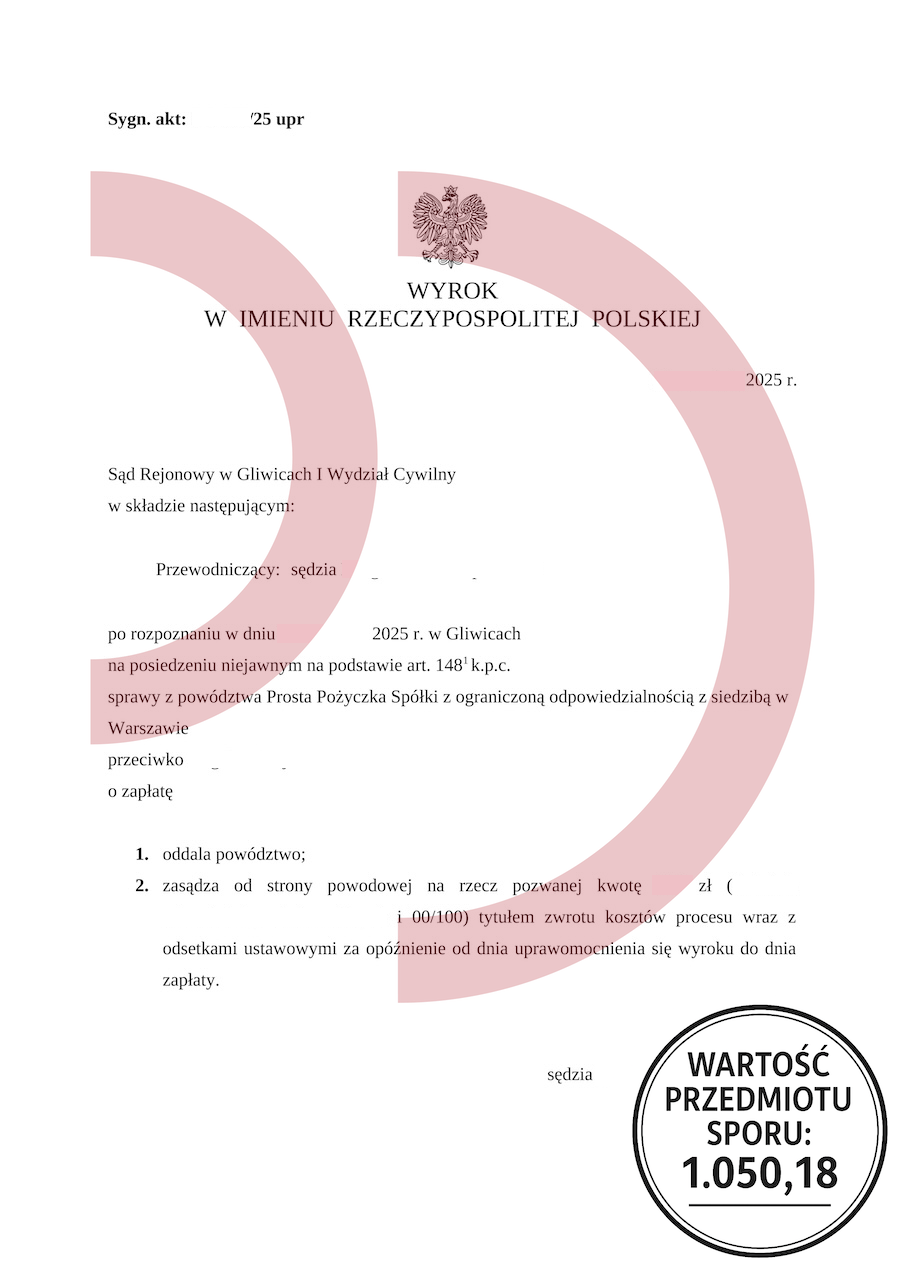 Uzyskany efekt: Powództwo oddalone w całości, brak odsetek, brak kosztów procesu.