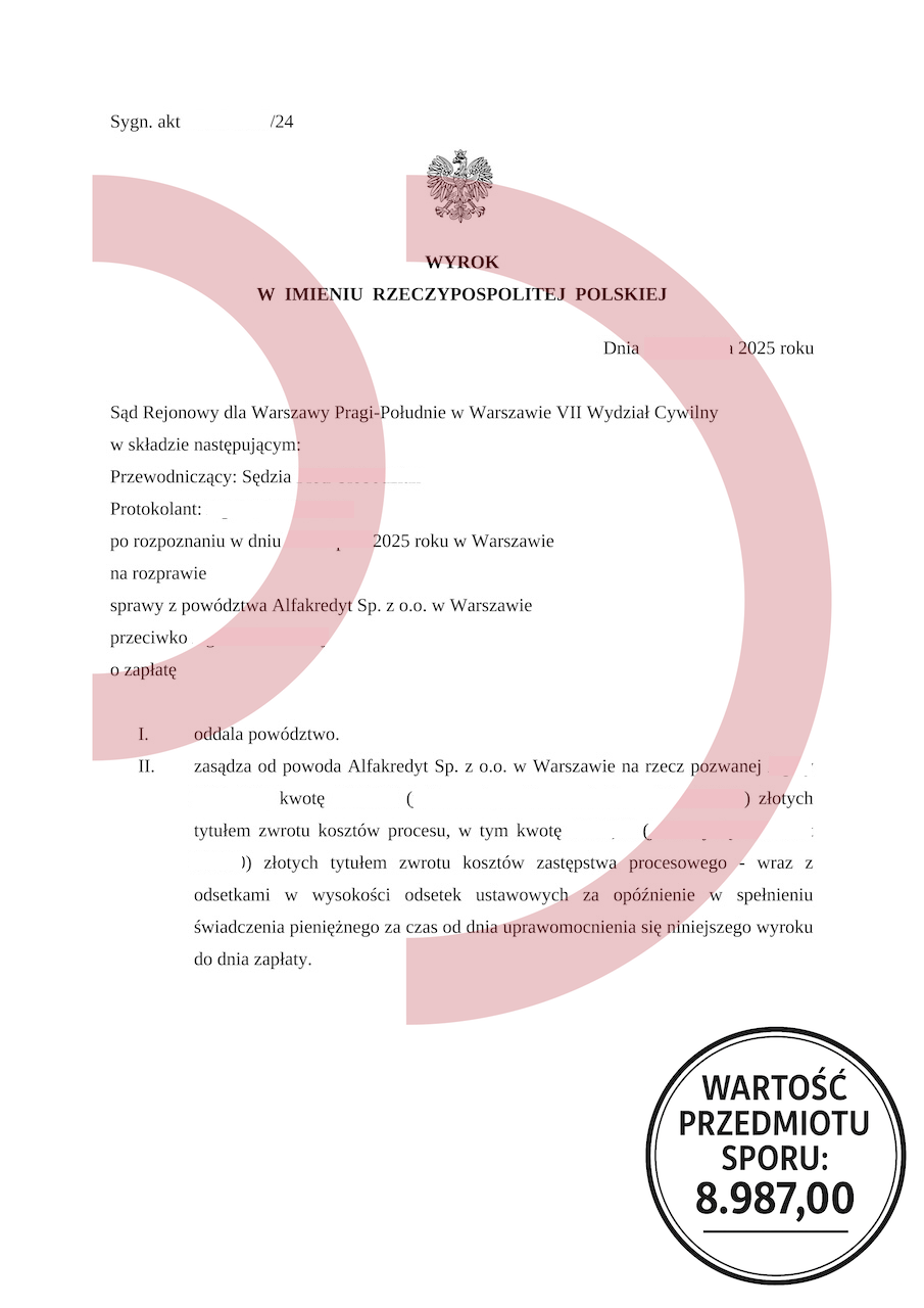 Uzyskany efekt: Powództwo oddalone w całości, brak odsetek, brak kosztów procesu.