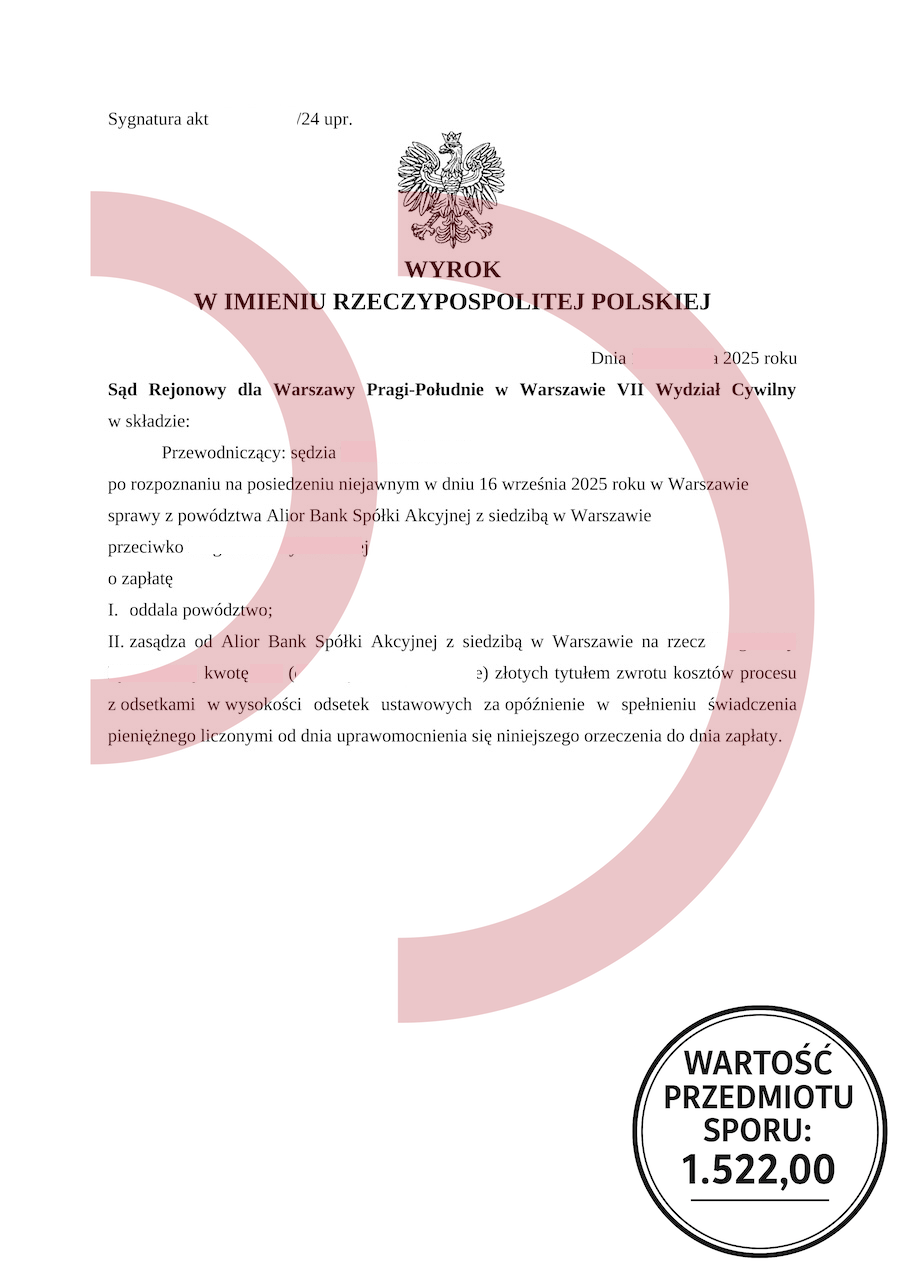 Uzyskany efekt: Powództwo oddalone w całości, brak odsetek, brak kosztów procesu.
