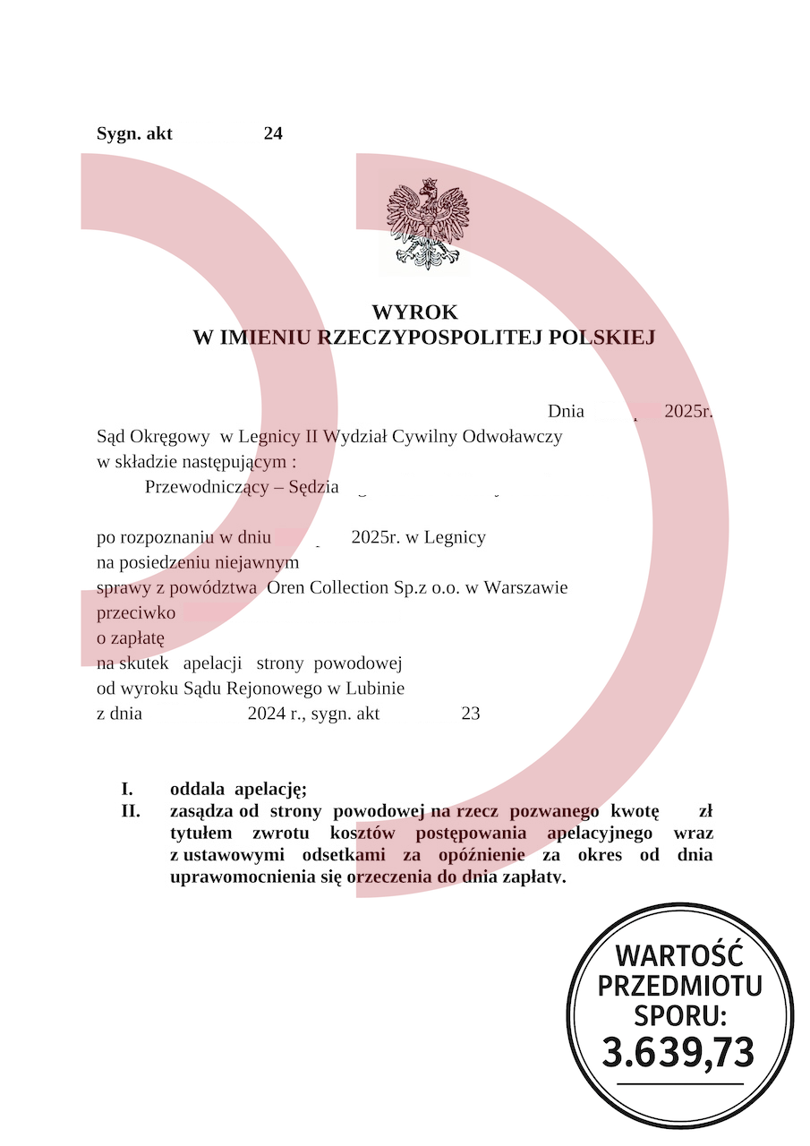 Uzyskany efekt: Powództwo oddalone w całości, brak odsetek, brak kosztów procesu.
