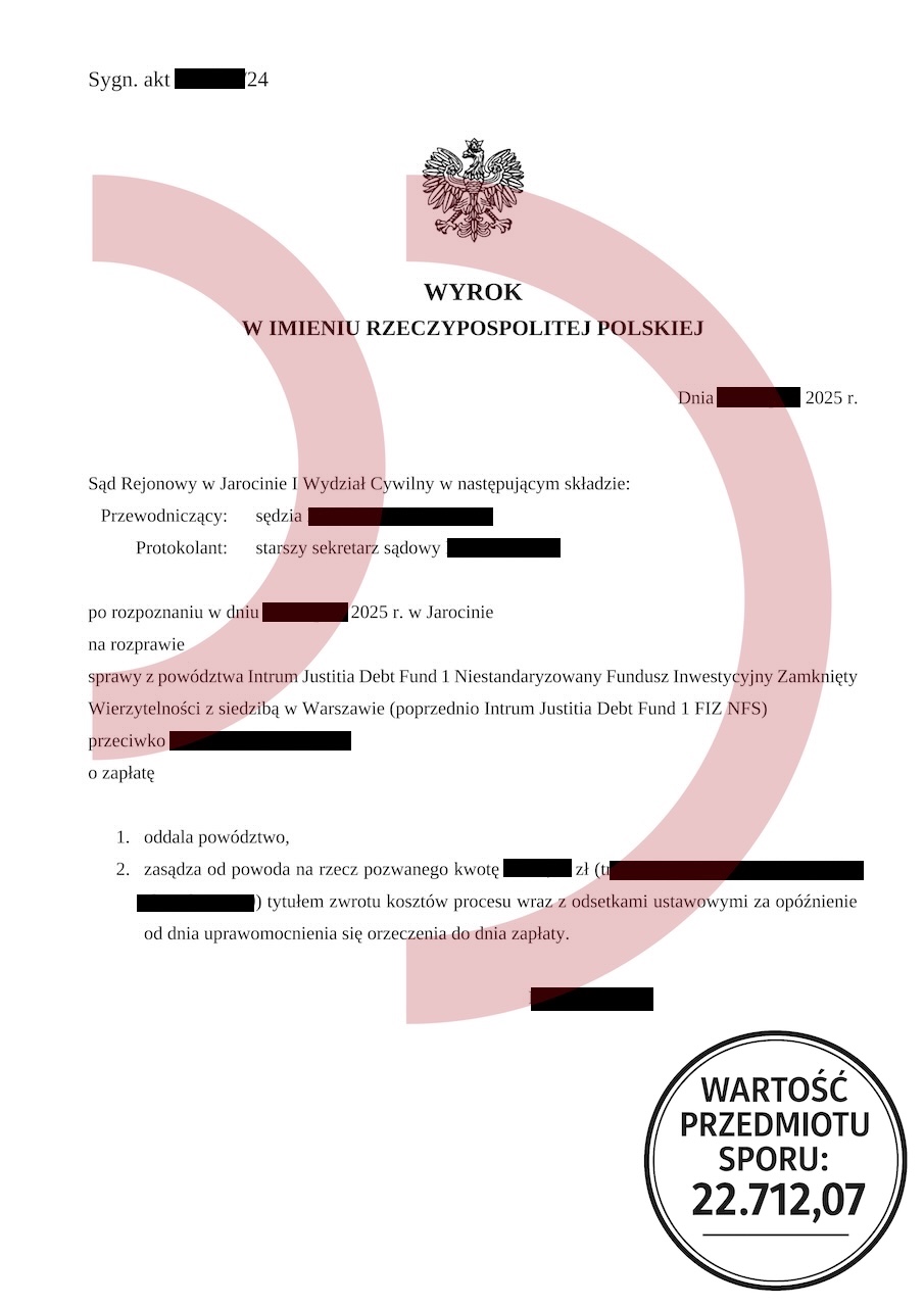 Uzyskany efekt: Powództwo oddalone w całości, brak odsetek, brak kosztów procesu