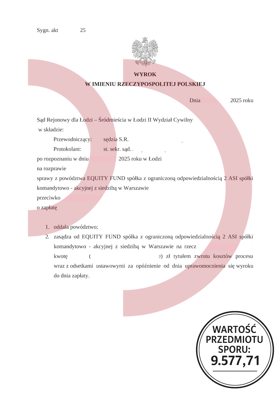Uzyskany efekt: Powództwo oddalone w całości, brak odsetek, brak kosztów procesu
