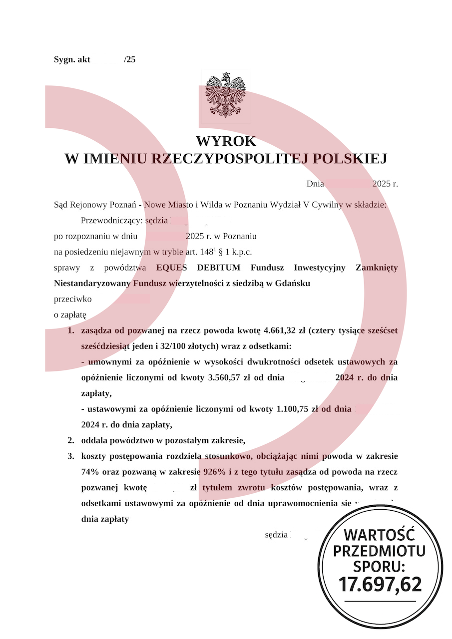 Uzyskany efekt: Powództwo oddalone w całości, brak odsetek, brak kosztów procesu