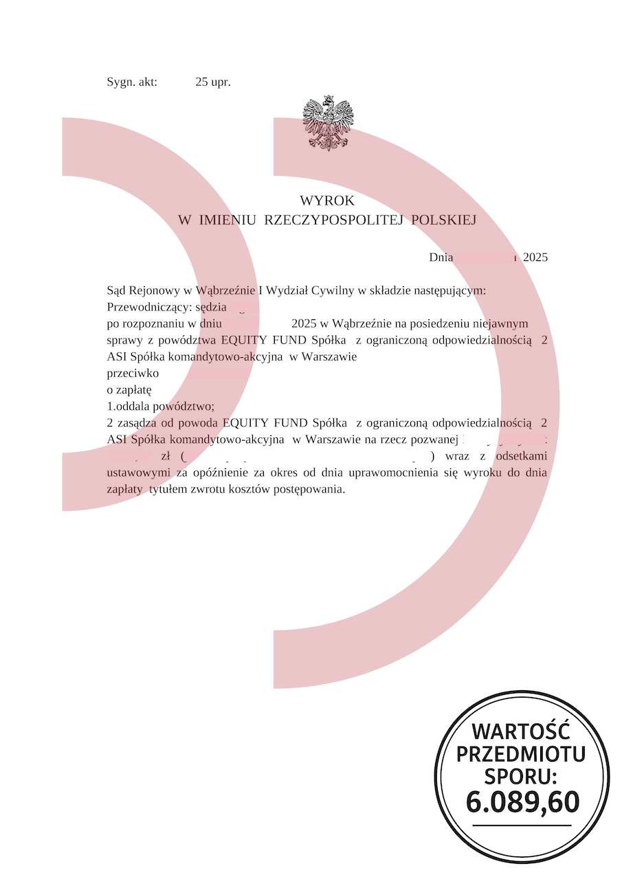 Uzyskany efekt: Powództwo oddalone w całości, brak odsetek, brak kosztów procesu