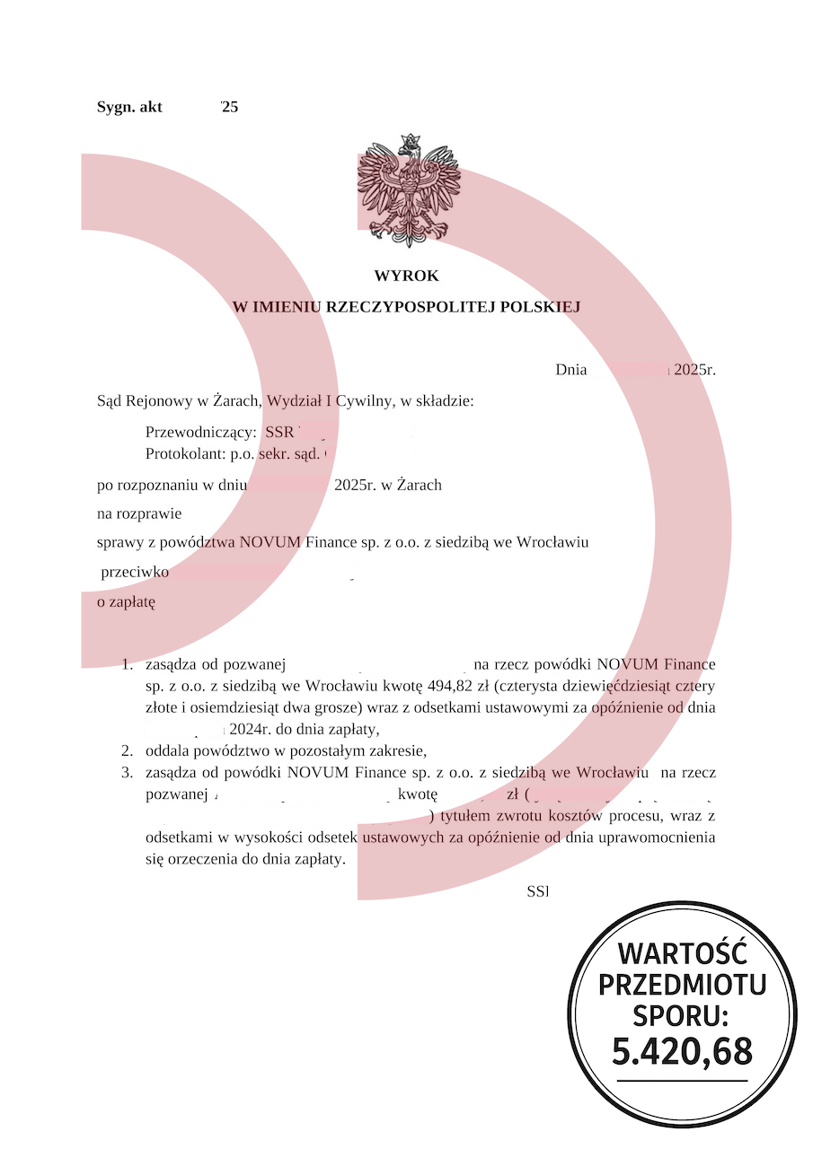Uzyskany efekt: Powództwo oddalone w całości, brak odsetek, brak kosztów procesu