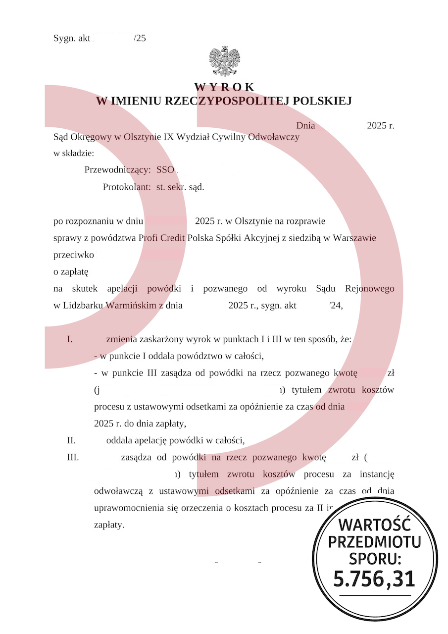 Uzyskany efekt: Powództwo oddalone w całości, brak odsetek, brak kosztów procesu.