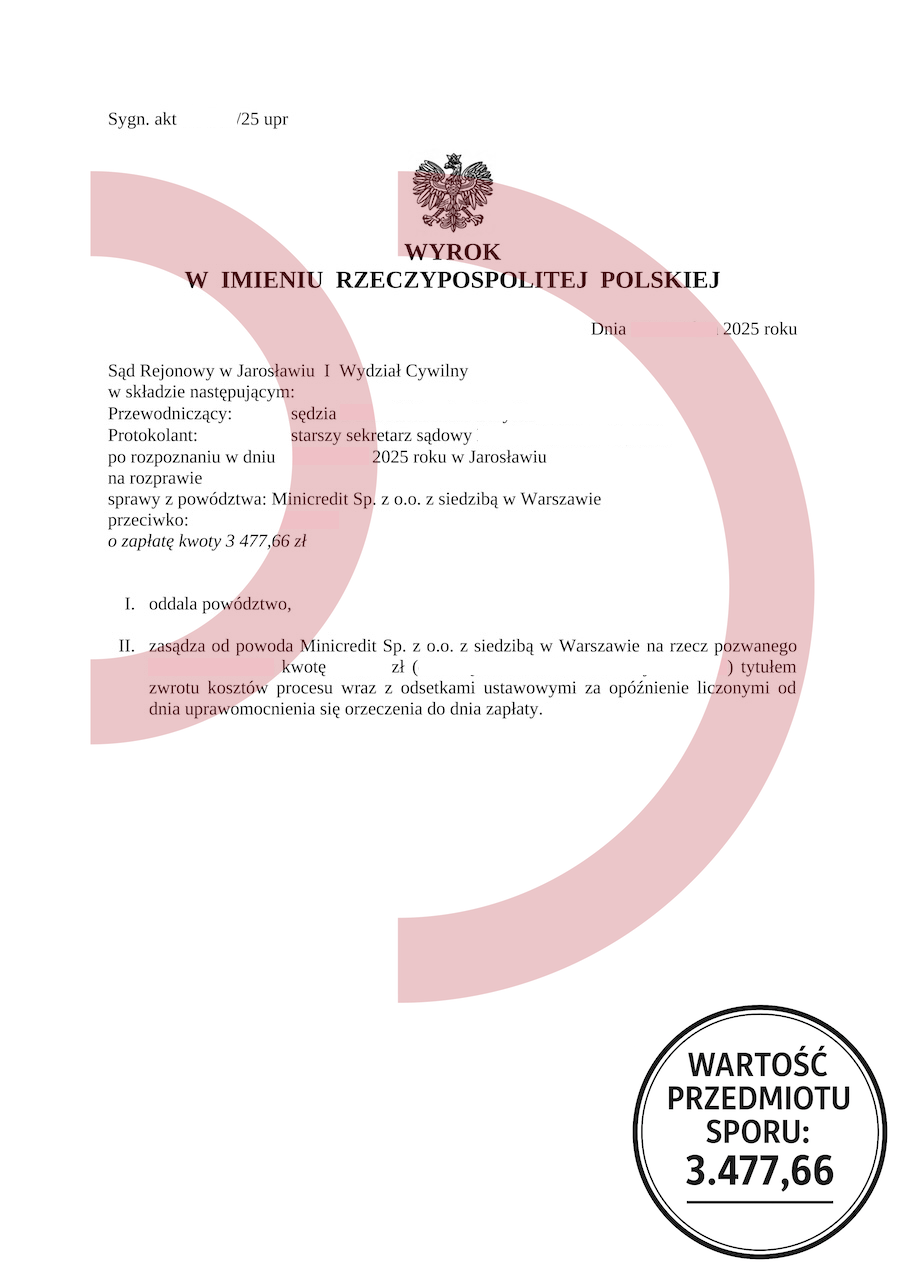 Uzyskany efekt: Powództwo oddalone w całości, brak odsetek, brak kosztów procesu.