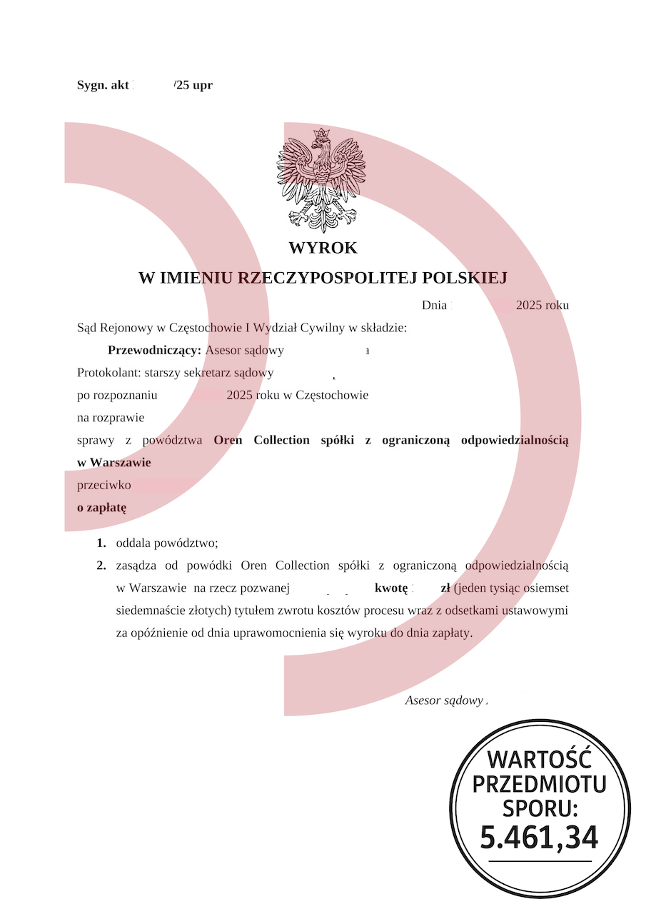 Uzyskany efekt: Powództwo oddalone w całości, brak odsetek, brak kosztów procesu.