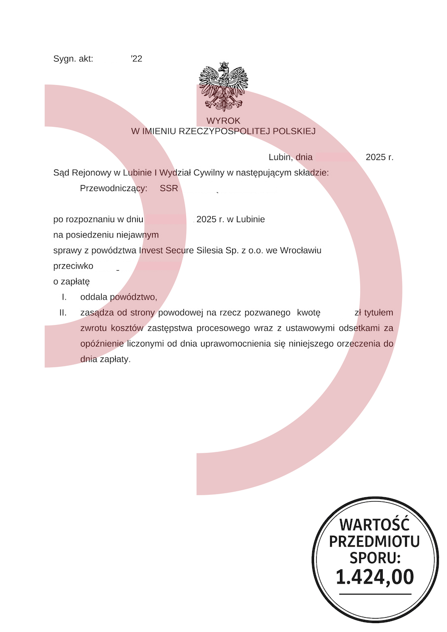 Uzyskany efekt: Powództwo oddalone w całości, brak odsetek, brak kosztów procesu