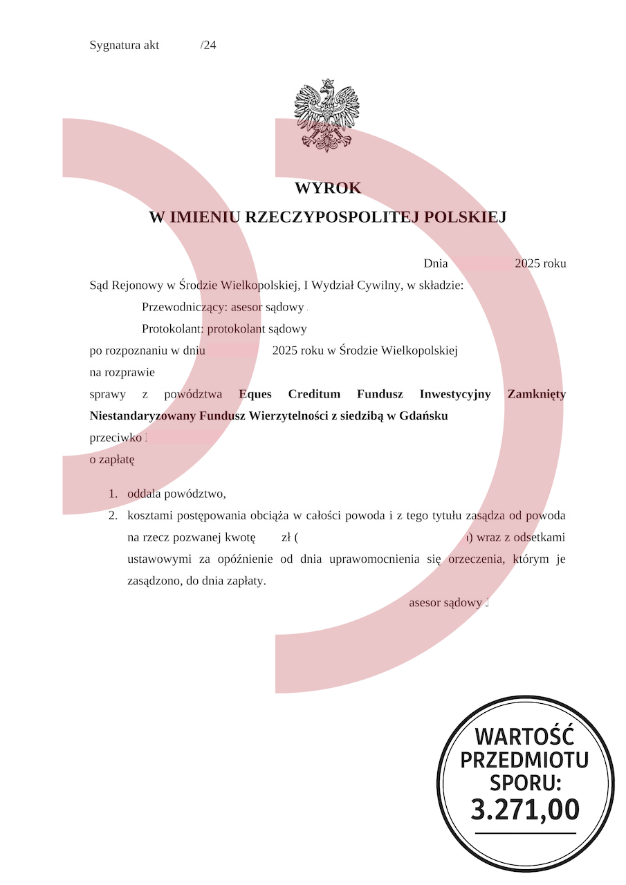 Uzyskany efekt: Powództwo oddalone w całości, brak odsetek, brak kosztów procesu