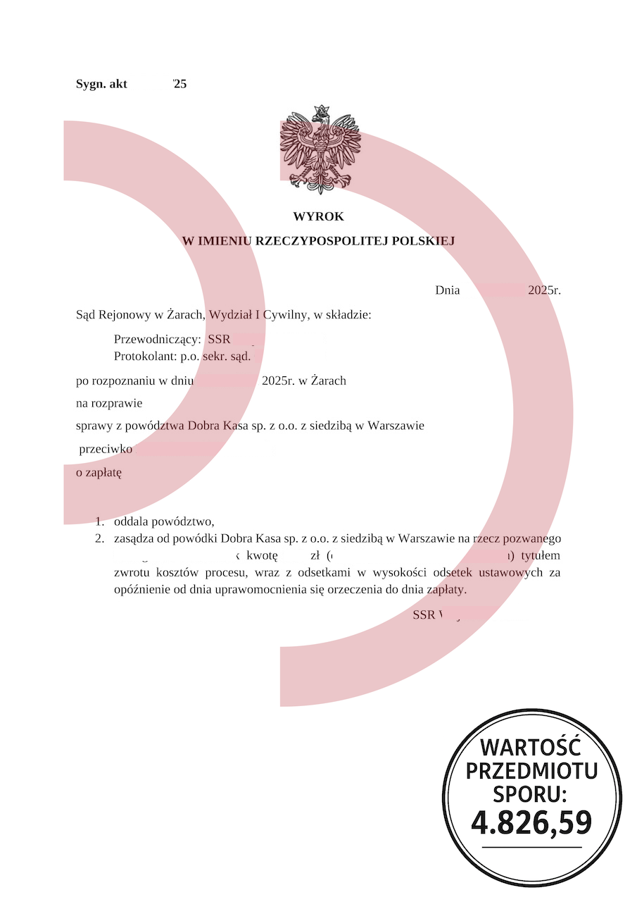 Uzyskany efekt: Powództwo oddalone w całości, brak odsetek, brak kosztów procesu