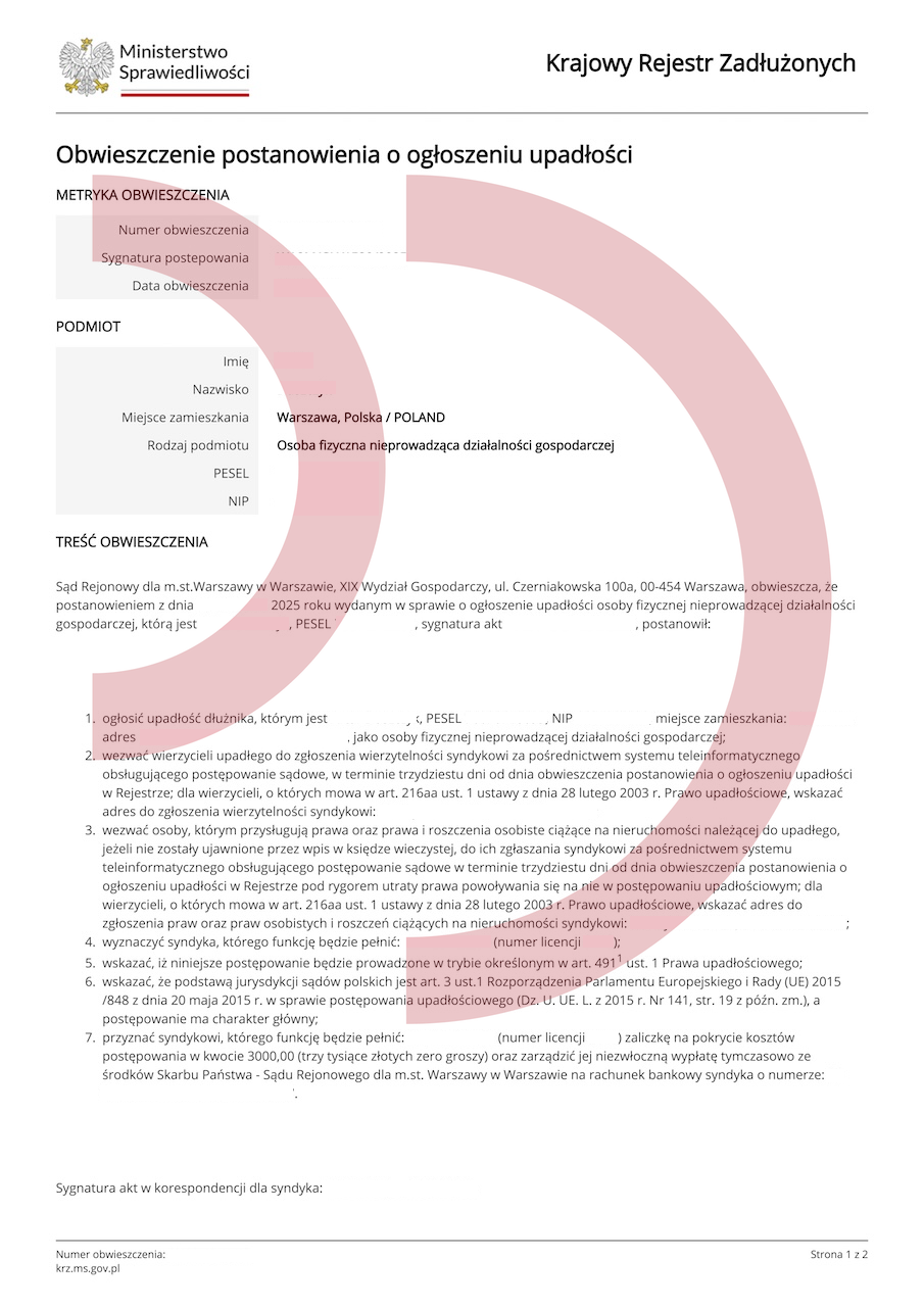 Uzyskany efekt: Postanowienie sądu o ogłoszeniu upadłości konsumenckiej