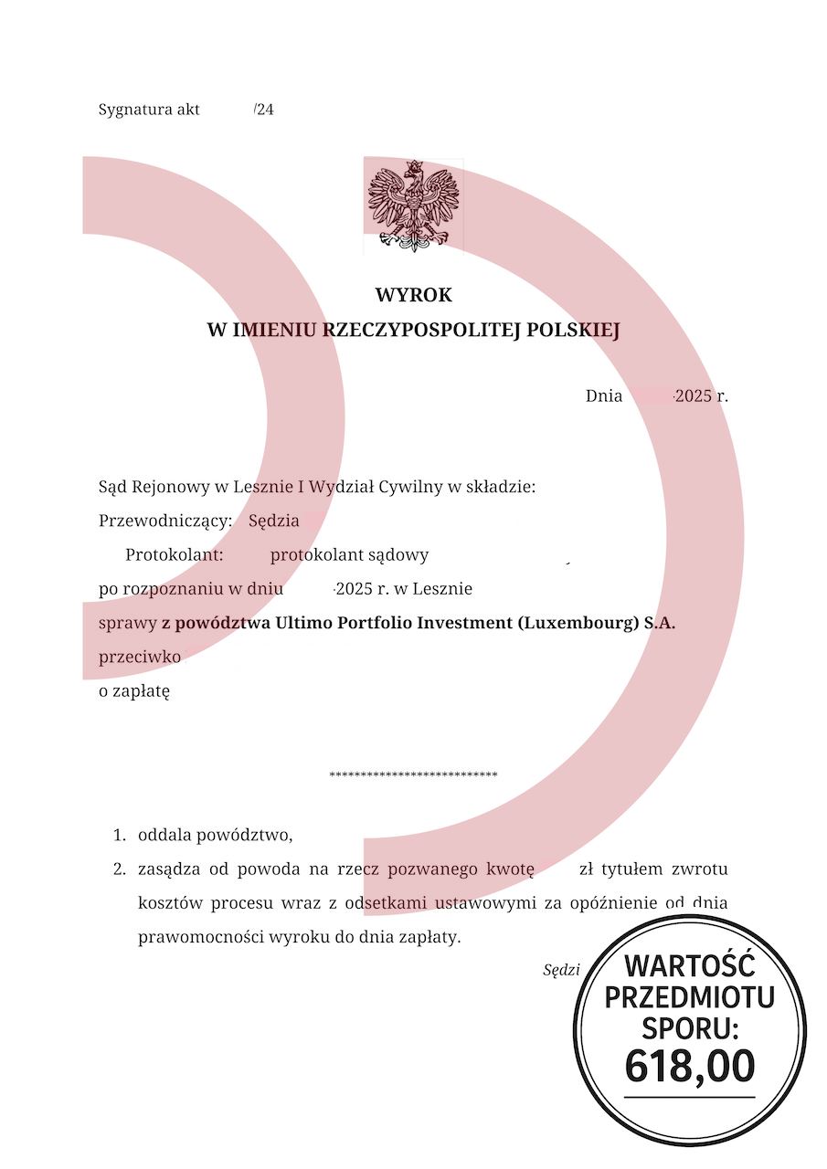 Uzyskany efekt: Powództwo oddalone w całości, brak odsetek, brak kosztów procesu.