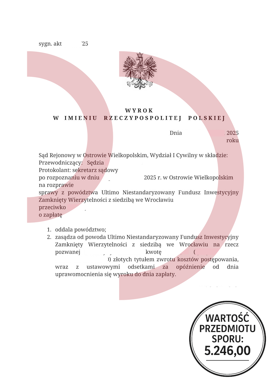 Dobrym przykładem skutecznego działania kancelarii jest sprawa z powództwa Ultimo NSFIZ o zapłatę 5.246,00 zł, która toczyła się przed Sądem Rejonowym w Ostrowie Wielkopolskim. Dzięki profesjonalnej obronie dłużnika sąd oddalił powództwo w całości, a dodatkowo zasądził od powoda zwrot kosztów procesu. To dowód na to, że prawna pomoc przy wyjściu z długów naprawdę działa i może przynieść wymierne efekty.