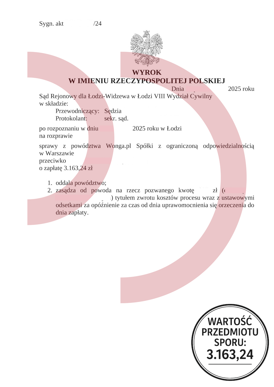 W tej sprawie, której wartość przedmiotu sporu wynosiła 3.163,24 zł, sąd rejonowy oddalił powództwo w całości, uznając racje strony pozwanej. To dowód, że dobrze przygotowana linia obrony może całkowicie zmienić bieg wydarzeń i uwolnić konsumenta od nieuzasadnionego roszczenia. Takie wyroki potwierdzają, że oddłużanie to realna szansa, a nie tylko teoria – pod warunkiem, że prowadzą je profesjonaliści.