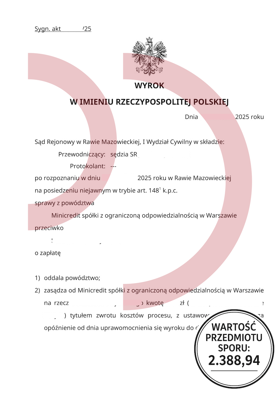 Uzyskany efekt: Powództwo oddalone w całości, brak odsetek, brak kosztów procesu