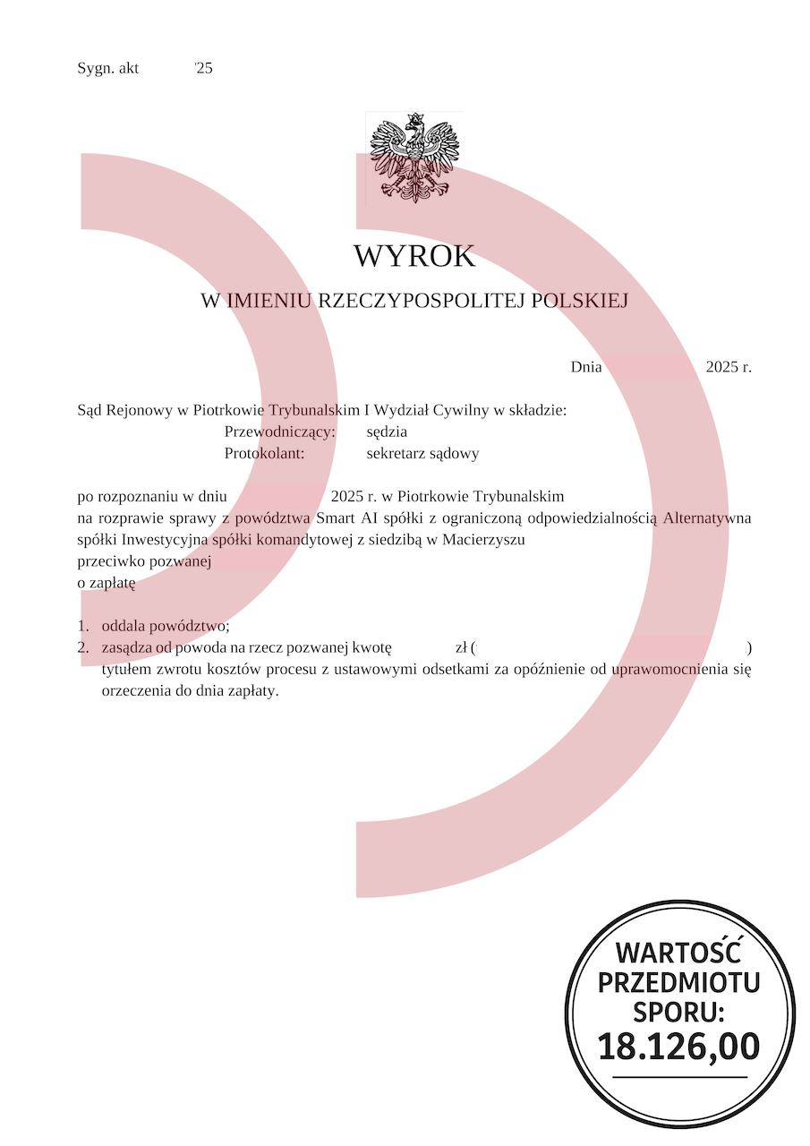Sprawa przeciwko Smart AI o 18.126,00 zł, zakończona całkowitym oddaleniem powództwa, jest jednym z przykładów, które inspirują do działania. Dlatego, jeśli szukasz miejsca, które naprawdę pomaga zrozumieć, jak walczyć z długami i wygrać z firmami pożyczkowymi – szukaj informacji na najlepszym forum kredytowym w Polsce.