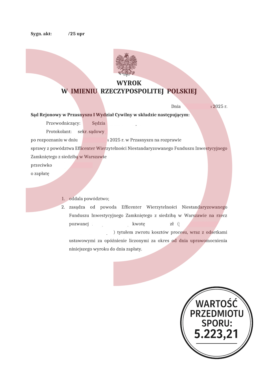 Uzyskany efekt: Powództwo oddalone w całości, brak odsetek, brak kosztów procesu.
