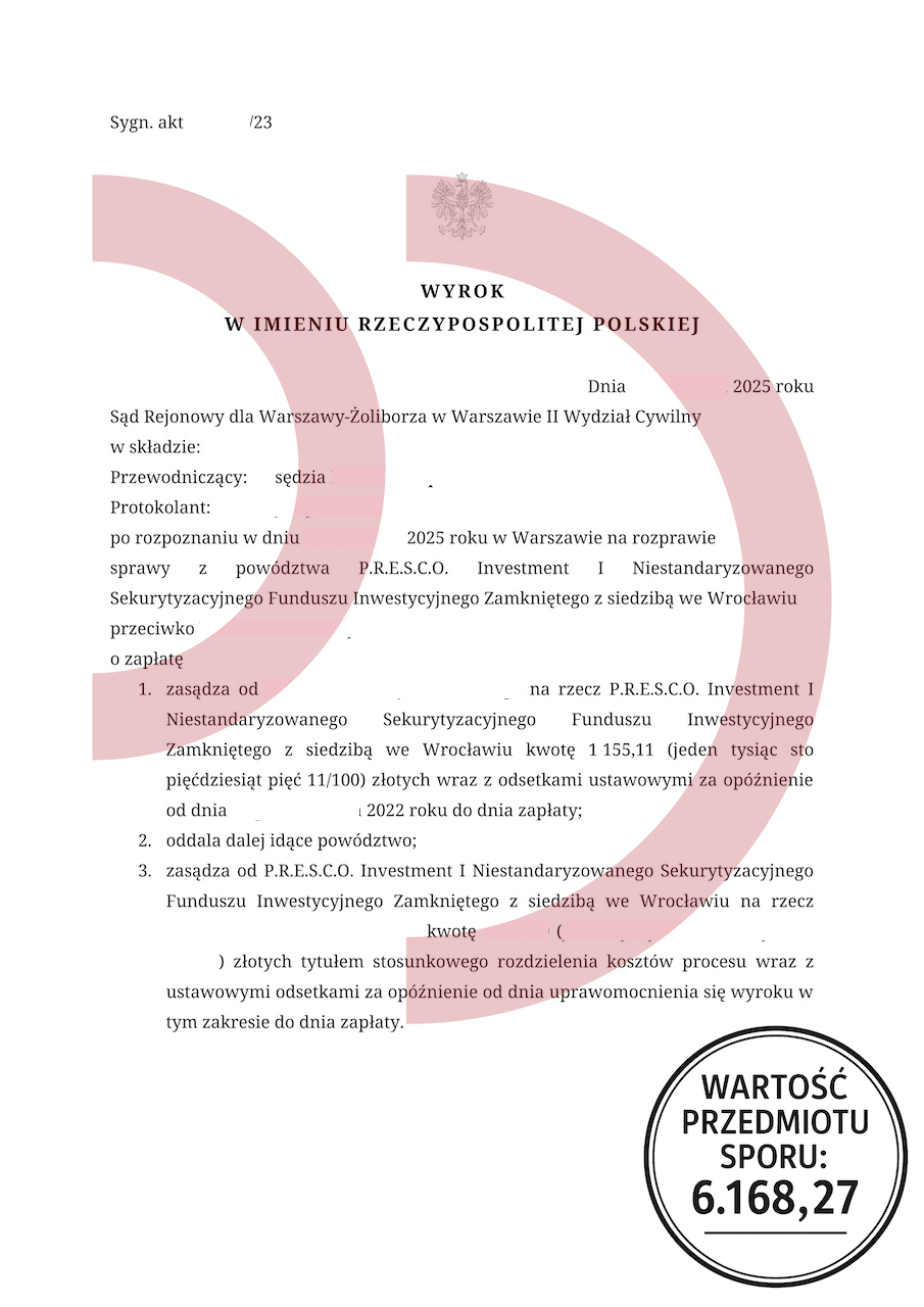 Uzyskany efekt: Powództwo oddalone w części, zasądzono 1.155,11 zł