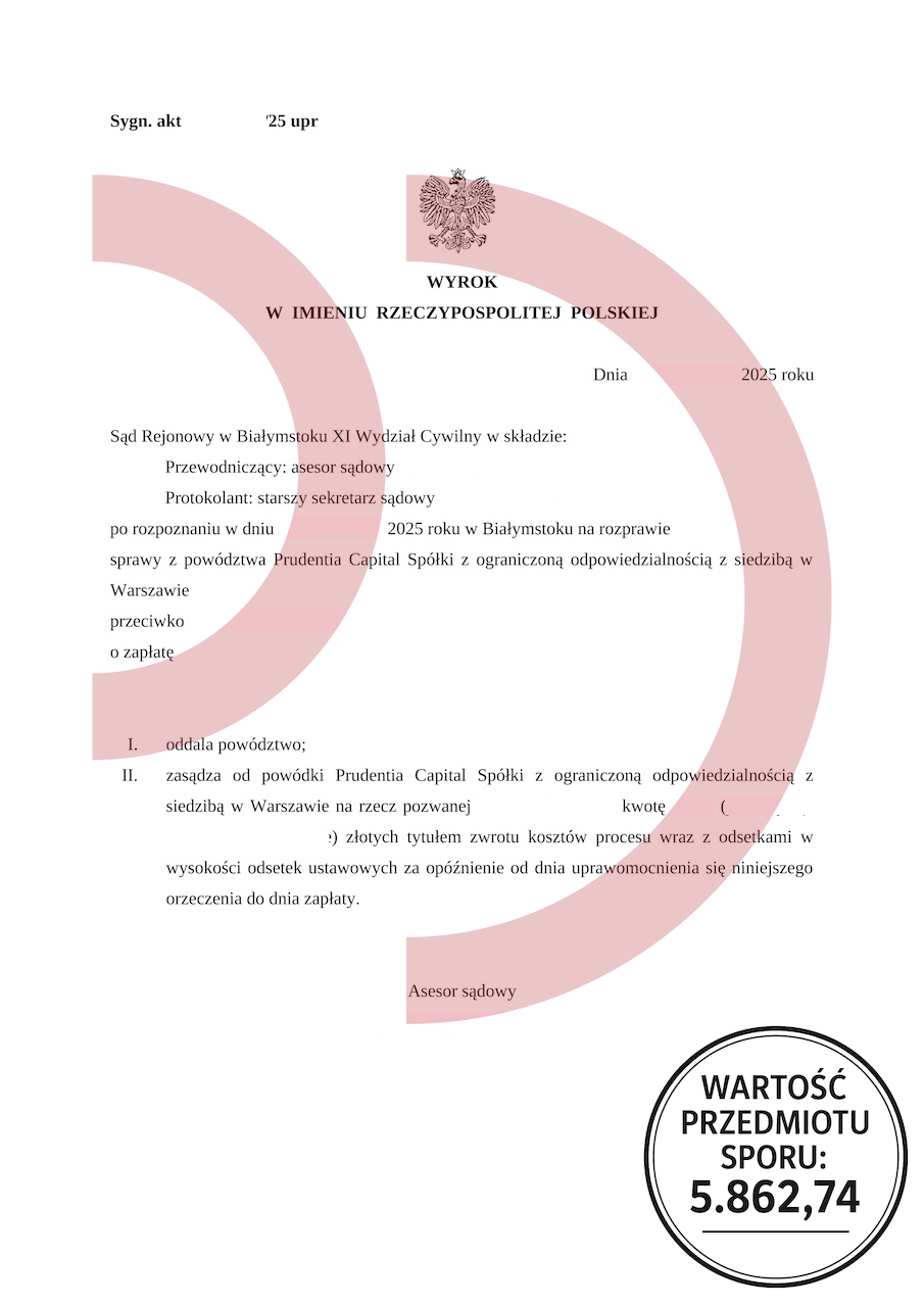 Wielu naszych klientów potwierdza, że dopiero wtedy, gdy trafili do specjalistów, którzy rozumieją zarówno przepisy, jak i emocje towarzyszące zadłużeniu, poczuli prawdziwą ulgę. Świetnym przykładem skutecznej pomocy jest wyrok w sprawie z powództwa Prudentia Capital Sp. z o.o. o zapłatę 5.862,74 zł, w której Sąd Rejonowy w Białymstoku oddalił powództwo w całości, a dodatkowo zasądził na rzecz pozwanej zwrot kosztów procesu wraz z odsetkami. To nie tylko zwycięstwo prawne, ale też ogromna ulga psychiczna dla osoby, która przez wiele miesięcy żyła w napięciu.