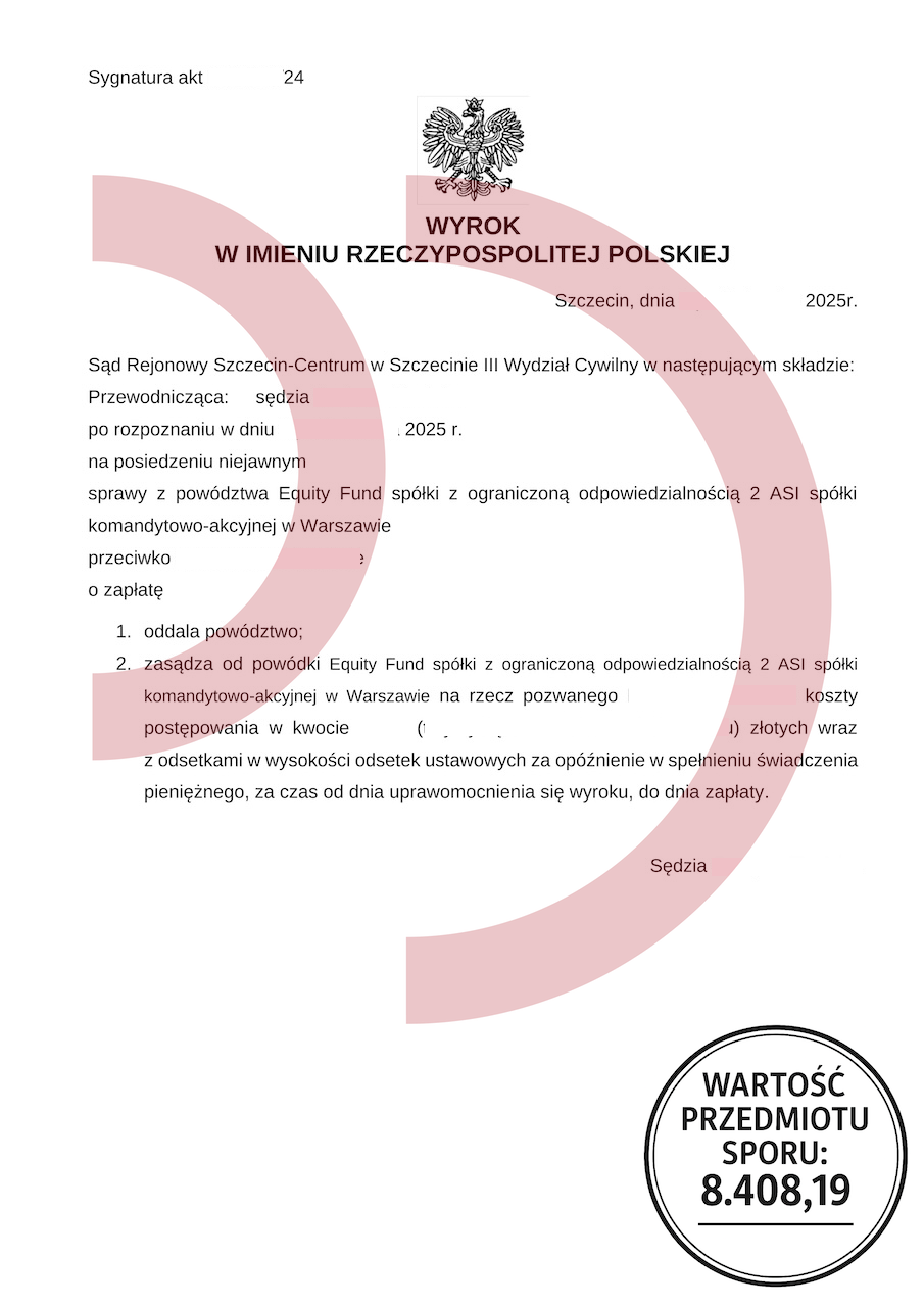 Uzyskany efekt: Powództwo oddalone w całości, brak odsetek, brak kosztów procesu.