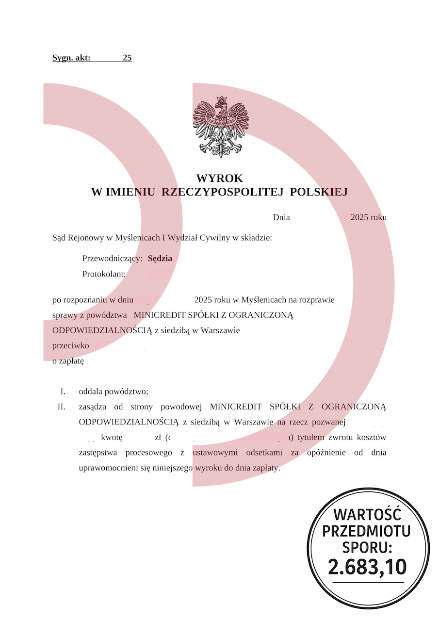 Uzyskany efekt: Powództwo oddalone w całości, brak odsetek, brak kosztów procesu.