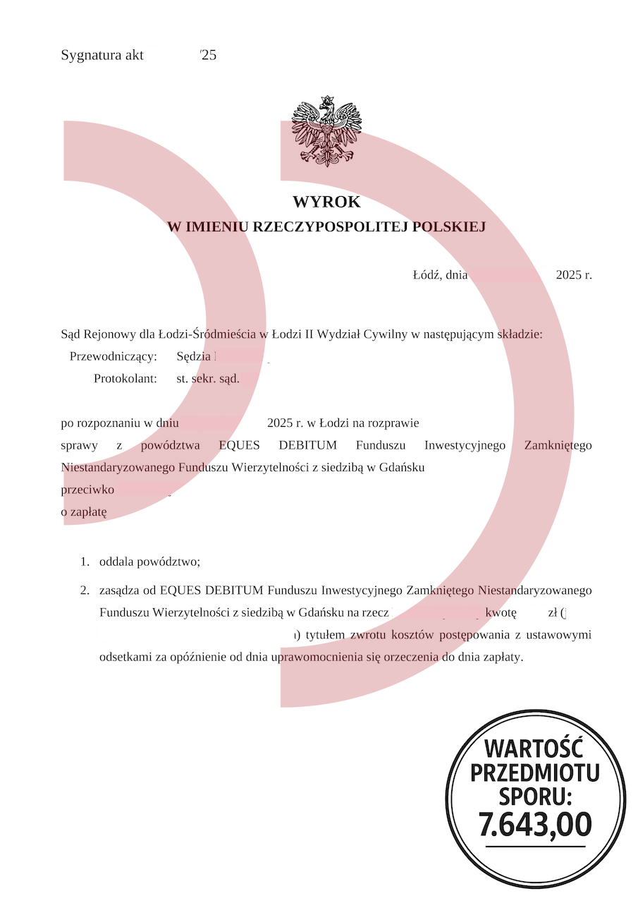 Sprawa z Łodzi o 7.643,00 zł zakończyła się pełnym sukcesem dłużnika. Powództwo Eques Debitum zostało oddalone, a fundusz musiał pokryć koszty procesu. To historia, którą powinien poznać każdy, kto dziś szuka hasła „poradnik jak spłacić długi”.