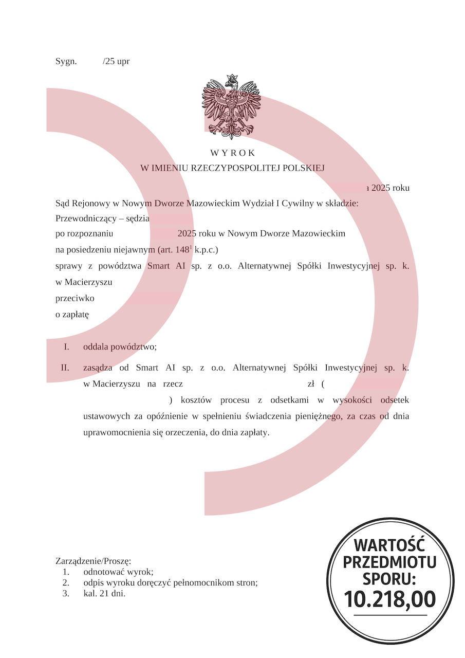 Wiele osób, które zaciągnęły kilka lub kilkanaście krótkoterminowych pożyczek, doskonale zna to uczucie: strach przed kolejnym telefonem z windykacji, pismo z sądu, a potem myśl, że „to już koniec”. Nic bardziej mylnego. Z pomocą przychodzi dobry prawnik od długów w chwilówkach, który potrafi zamienić chaos finansowy w plan działania. Takich spraw każdego roku trafia do polskich sądów tysiące – i coraz częściej kończą się one zwycięstwem konsumentów. Świetnym przykładem jest wyrok Sądu Rejonowego w Nowym Dworze Mazowieckim, w którym oddalono powództwo Smart AI sp. z o.o. o zapłatę kwoty 10.218,00 zł. Sąd nie tylko uznał roszczenie za bezzasadne, ale także zasądził na rzecz pozwanej zwrot kosztów procesu. To kolejny dowód, że z pomocą specjalistów można skutecznie bronić się przed nieuczciwymi roszczeniami parabanków i funduszy inwestycyjnych.
