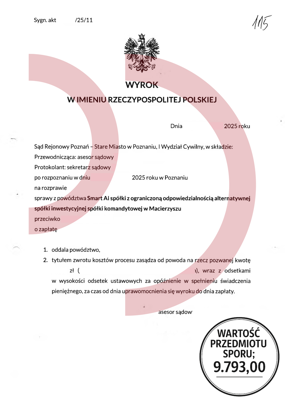 Reklamy krzyczą: „pieniądze w 15 minut!”, „bez zaświadczeń!”, „dostaniesz nawet, jeśli bank odmówił!”. Tak właśnie działają błyskawiczne kredyty bez zdolności kredytowej – pozornie szybkie i wygodne rozwiązanie dla osób w potrzebie. Niestety, dla wielu Polaków stają się początkiem długotrwałych problemów finansowych, które potrafią doprowadzić nawet do komornika. Na szczęście coraz częściej to sądy stają po stronie konsumentów, pokazując, że parabanki i fundusze inwestycyjne nie mogą bezkarnie żądać zapłaty za nieudokumentowane roszczenia. Doskonałym przykładem jest wyrok Sądu Rejonowego Poznań-Stare Miasto, który oddalił powództwo Smart AI sp. z o.o. o zapłatę 9.793,00 zł. Sprawa ta pokazuje, że walka z parabankiem może zakończyć się pełnym sukcesem.