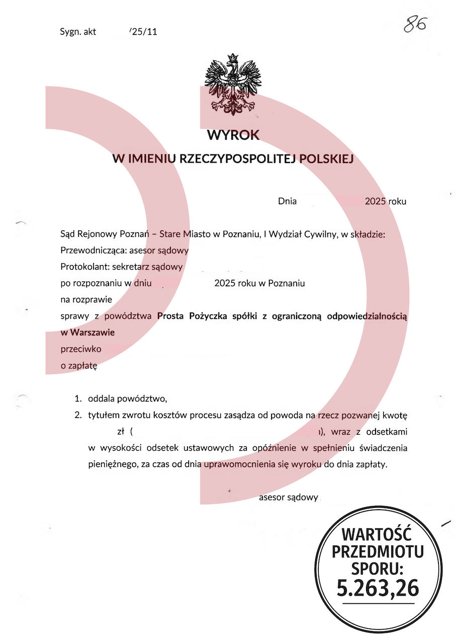 Uzyskany efekt: Powództwo oddalone w całości, brak odsetek, brak kosztów procesu
