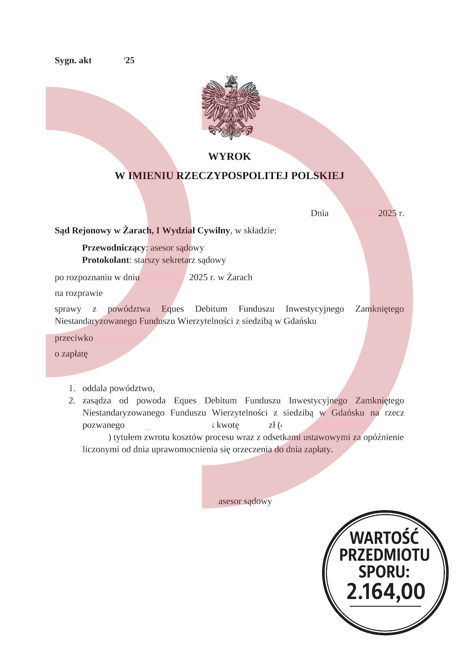 Dobrym przykładem skutecznej obrony jest niedawny wyrok Sądu Rejonowego w Żarach, który oddalił powództwo Eques Debitum NSFIZ przeciwko konsumentowi o zapłatę kwoty 2.164,00 zł. Sąd uznał, że roszczenie było niezasadne, a dodatkowo zasądził zwrot kosztów procesu na rzecz pozwanej. Ten wyrok pokazuje, że gdy dłużnik skorzysta z pomocy prawnej, może skutecznie obronić się nawet przed profesjonalną instytucją finansową. To właśnie praktyczny przykład, który uczy, że warto zrozumieć, jak poradzić sobie z długami z pomocą doświadczonego prawnika.