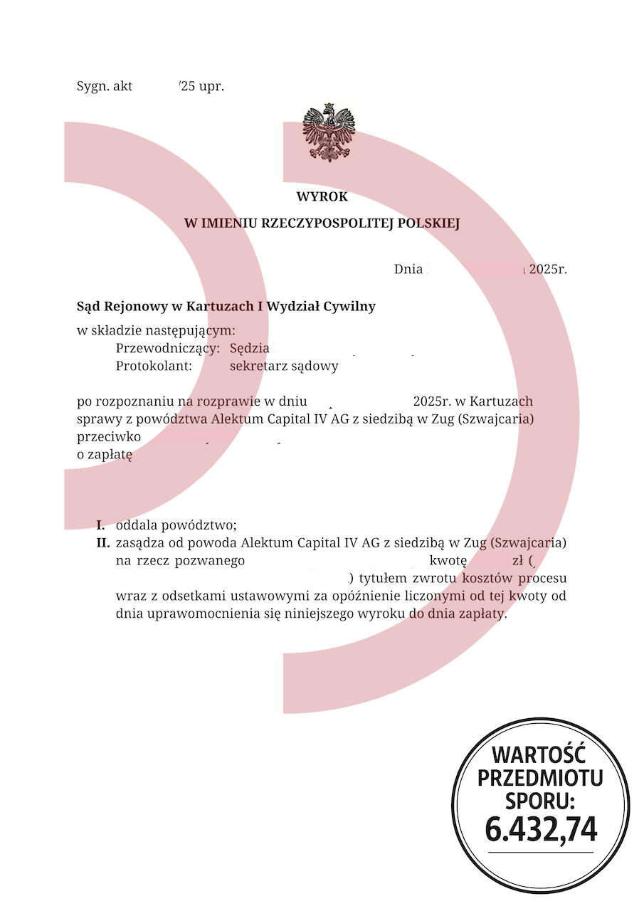 Uzyskany efekt: Powództwo oddalone w całości, brak odsetek, brak kosztów procesu