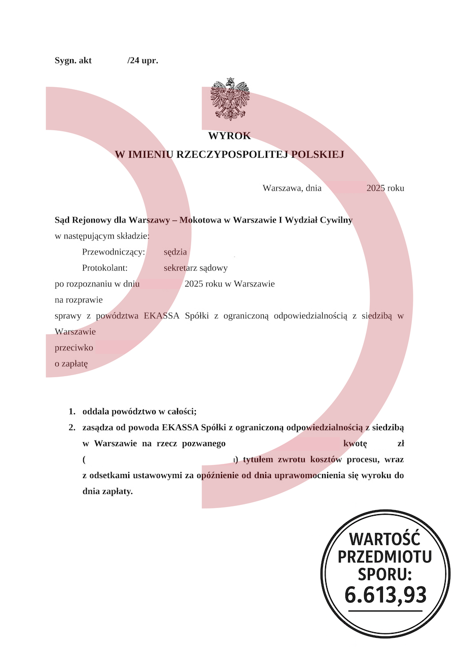 W czasach, gdy coraz więcej osób zmaga się z problemem nadmiernego zadłużenia, adwokacka pomoc w wyjściu z długów staje się nie tylko wsparciem prawnym, ale często jedynym sposobem na odzyskanie stabilności finansowej i emocjonalnej. Długi potrafią przytłoczyć tak bardzo, że zwykłe pismo z firmy windykacyjnej wywołuje strach, a pozew sądowy odbiera ostatnią resztkę nadziei. Tymczasem właściwe działania, odpowiednia analiza i doświadczenie prawnika mogą w pełni odmienić los osoby zadłużonej. Najlepszym dowodem na to, jak skuteczna może być adwokacka pomoc w wyjściu z długów, jest załączony wyrok Sądu Rejonowego dla Warszawy – Mokotowa, w którym powództwo EKASSA Sp. z o.o. o zapłatę 6.613,93 zł zostało oddalone w całości. Sąd zasądził także od powoda zwrot kosztów procesu wraz z odsetkami ustawowymi. To oznacza, że pozwany nie tylko nie zapłacił żądanej kwoty, ale otrzymał zwrot poniesionych wydatków. Takie orzeczenia są jasnym sygnałem, że walka ma sens – zwłaszcza gdy po stronie dłużnika stoi profesjonalny pełnomocnik.