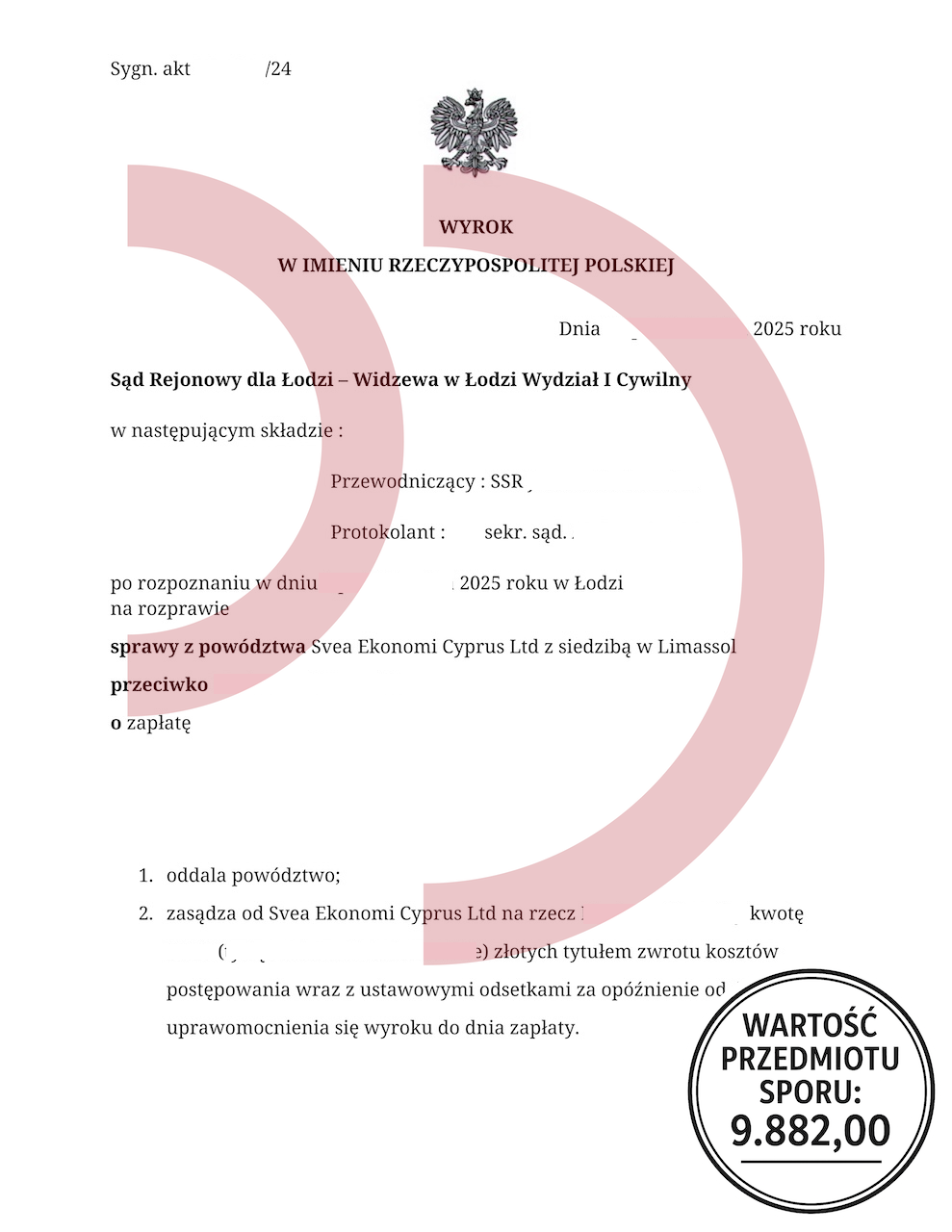 Uzyskany efekt: Powództwo oddalone w całości, brak odsetek, brak kosztów procesu