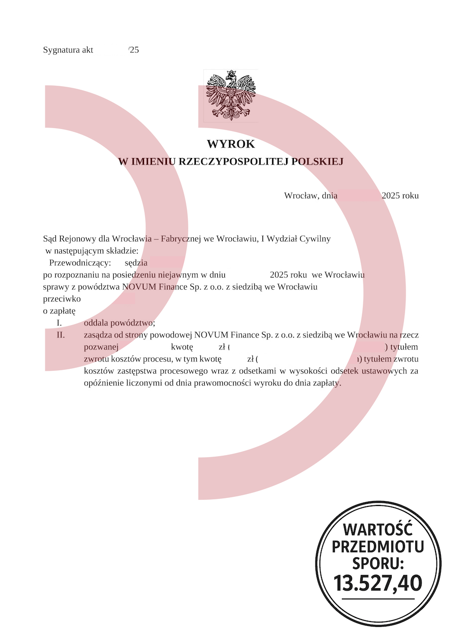 Wielu Polaków codziennie zmaga się z problemami finansowymi, które narastają miesiącami, a czasem nawet latami. Zaczyna się niewinnie: niewielka pożyczka „na chwilę”, następnie kolejna, potem zadłużenie staje się zbyt wysokie, by je samodzielnie kontrolować. Wtedy w głowie pojawia się dramatyczne pytanie: jak wyjść z długów porady fachowców, czyli gdzie znaleźć realne wsparcie, które nie tylko zatrzyma spirale zadłużenia, ale przede wszystkim da szansę na odzyskanie normalnego życia. Konsumenci pod presją windykacji często działają chaotycznie, podejmując decyzje, które tylko pogarszają ich sytuację. Tymczasem skuteczne oddłużanie wymaga strategii, wiedzy i doświadczenia – trzech elementów, które posiadają eksperci, a których brakuje przeciętnym dłużnikom. Najlepszym dowodem na to, jak ogromne znaczenie ma specjalistyczna pomoc, jest załączony wyrok Sądu Rejonowego dla Wrocławia – Fabrycznej. W sprawie z powództwa NOVUM Finance o zapłatę aż 13.527,40 zł, sąd oddalił powództwo w całości, jednocześnie zasądzając na rzecz pozwanej zwrot kosztów procesu. To klasyczny przykład, jak wyjść z długów porady fachowców mogą przełożyć się na realne, wymierne wyniki. Gdyby pozwana działała samodzielnie, najprawdopodobniej przegrałaby z dużą firmą finansową. Z pomocą specjalistów udało się jednak całkowicie odwrócić bieg sprawy.