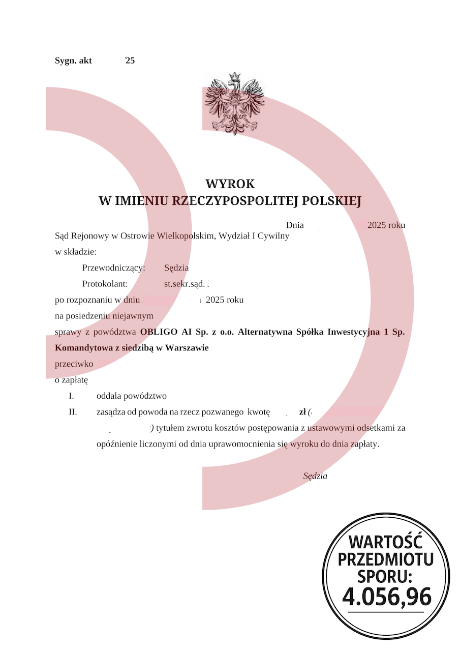 Właśnie to miało miejsce w sprawie przeciwko spółce OBLIGO AI. Analiza dokumentów pozwoliła ustalić, że roszczenie nie zostało udowodnione, a sąd w całości oddalił pozew. Taki wyrok praktycznie powoduje sprawne umorzenie postępowania windykacyjnego, ponieważ wszelkie próby dalszego dochodzenia tej kwoty stają się bezpodstawne.